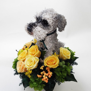 ペットのお悔やみお供え花でご利用いただきましたシュナウザーのオーダーメイドトピアリープリザーブドフラワーアレンジ