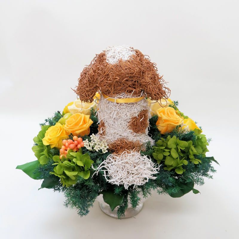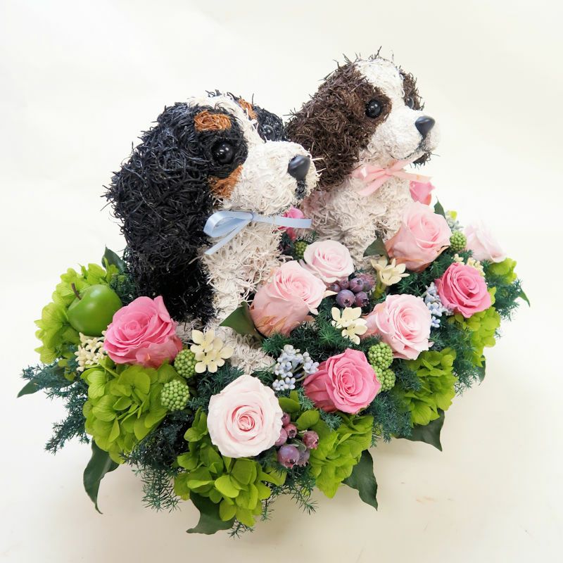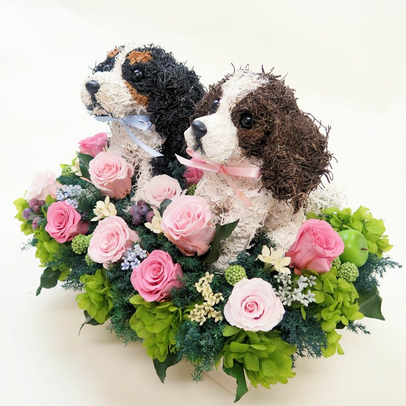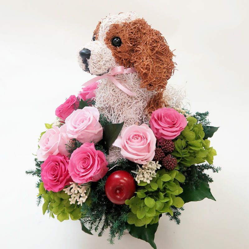 可愛いキャバリア グッズ。プリザーブドフラワーとのアレンジメントで上品で高級な作品を制作しています。柔らかな雰囲気と美しさがありますので開店祝いやお悔やみ、一周忌に感動されています。リアルでおしゃれなキャバリアのプリザーブドフラワーアレンジはオリジナルで他にはない特別感があり、見ているととても癒されます。