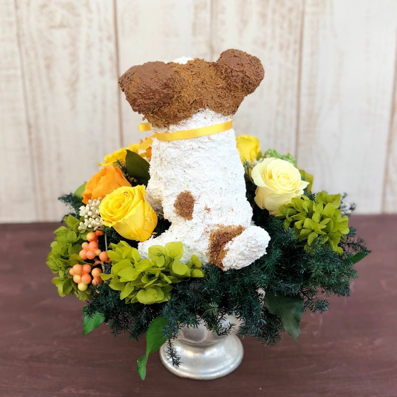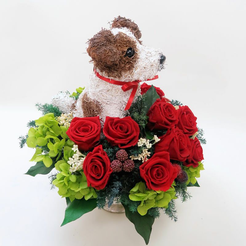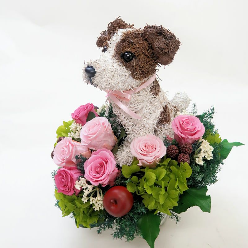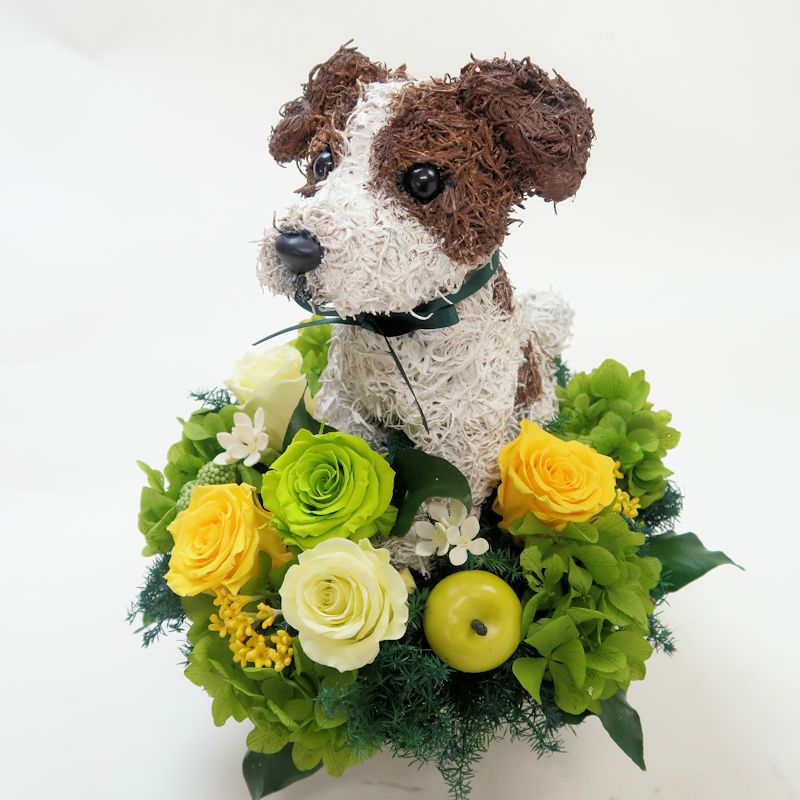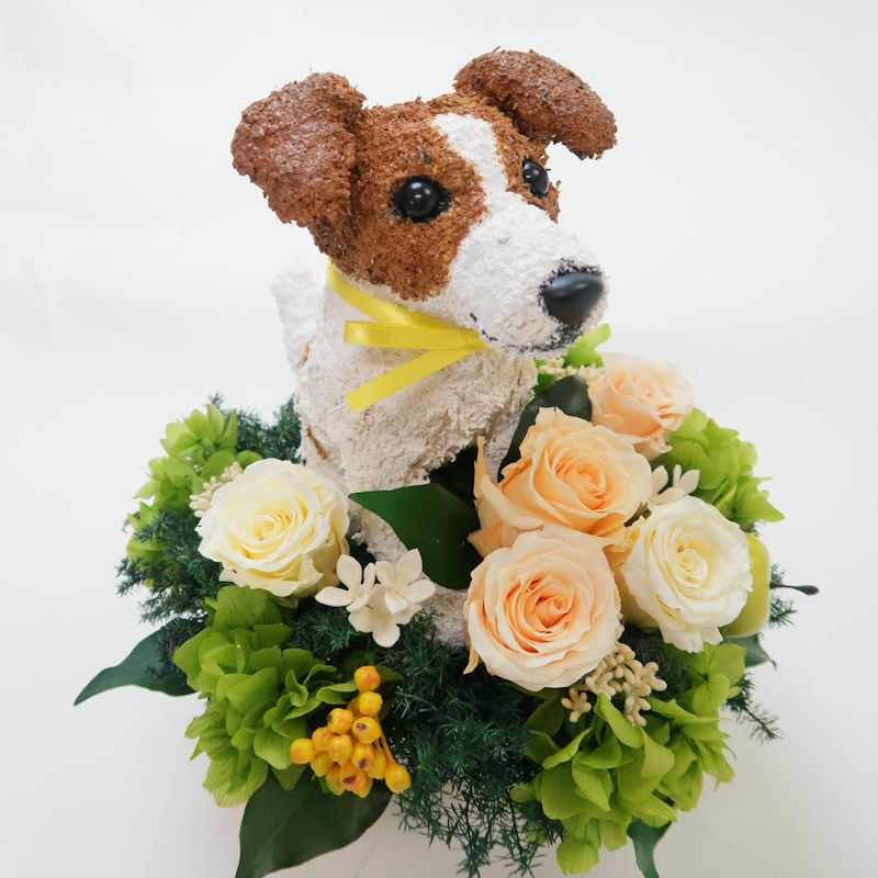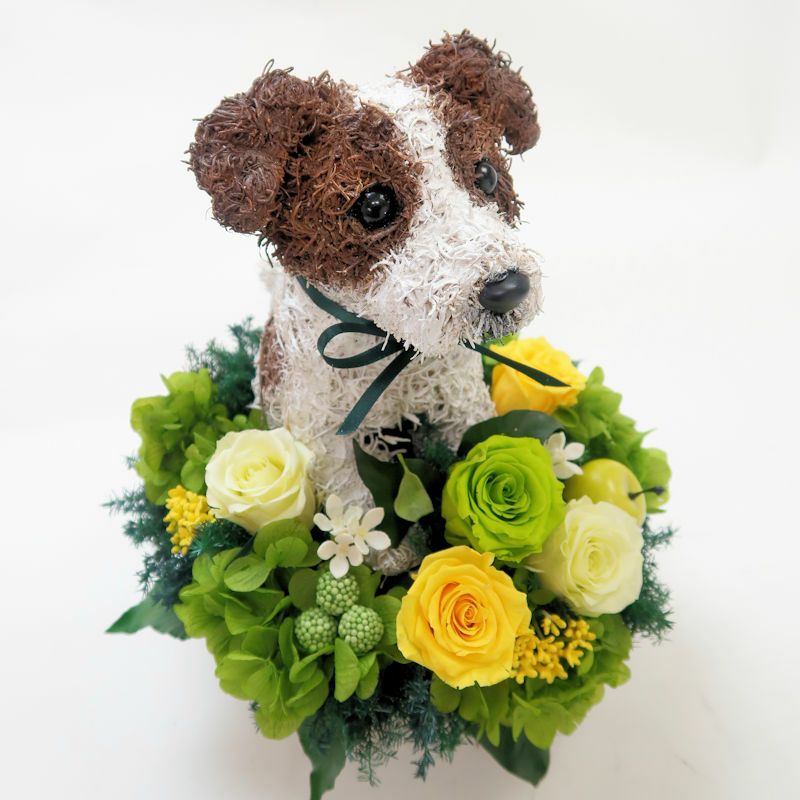 ジャックラッセルテリア好きプレゼントに喜ばれる、ジャックラッセルテリアの形のトピアリーのプリザーブドフラワーアレンジを制作販売しています。見ているだけでワクワクするアトリエ花倶楽部のオリジナルの作品たちは愛犬家方々に感動されているプレゼントです。おしゃれなジャックラッセルテリアグッズ。ウェルカムドッグ、結婚祝い、動物病院開院祝い、両親へのプレゼント、楽屋花などのお祝い、また、ペットのお悔やみにも男性へのプレゼントにも感動されています。