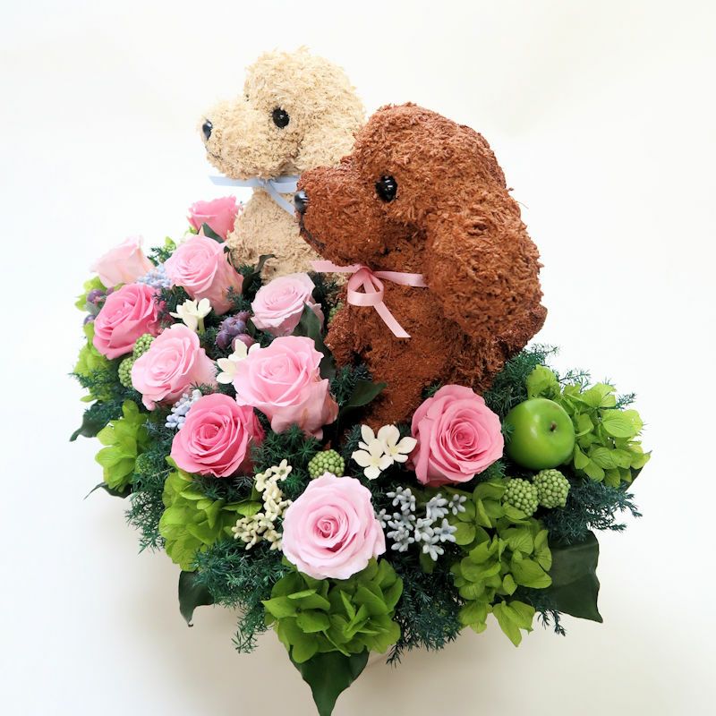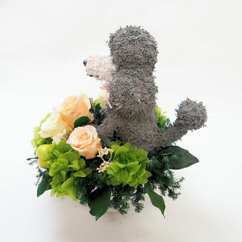 トイプードル好きの人に喜ばれるトイプードルグッズ。リアルでかわいい作品は愛犬家の人へのプレゼントに最適です。高級感があり他には無い、特別感で幸せな気持ちになる犬のフラワーギフトです。プリザーブドフラワーアレンジはきれいに長く飾れるのも魅力です。