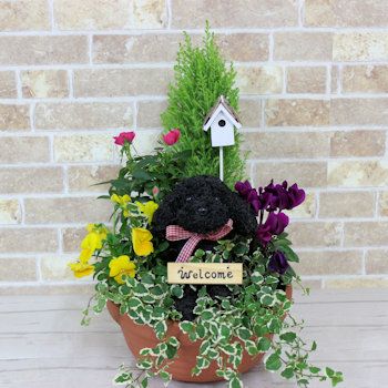 プードルの可愛いトピアリーの寄せ植え です。画像は黒のプードルですが、レッド(赤茶)ブラウン(濃茶)、チョコレート、アプリコット、グレー、などに変更できます。 寄せ植えにするお花は季節のお花が入ります。コニファー類とお花の苗3種類、プミラまたはアイビーなどの季節のお花のアレンジです。季節により寄せ植えにできるようなお花が少ない時期には寄せ植えの販売を中止させていただきます。(7月から9月ごろ)また雪が降るころの寒冷地への配達も凍ってしまうこともあるのでお届けできません。プレートなどのオーナメント類は別料金です。オーナメント類が必要な場合は別途オーナメントごとに金額がかかります。お水を植物に与えて、花殻を摘みお手入れするとお花も長く咲いてくれて可愛さ倍増です。家のオーナメント540円、ウェルカムプレート330円(売り切れ)です。