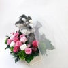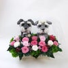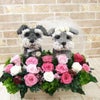 シュナウザーのウェルカムドール、ご結婚式用。シュナウザーを飼われている方にピッタリのウェディングアイテムのプリザーブドフラワーです。2匹の可愛いシュナウザーがご結婚式の受付にいたらゲストの方も和まれますね。シュナウザー好きのお二人らしい演出で受付でお二人にに代わって皆様をお迎えします。シュナウザー2匹の新郎新婦で、かわいらしいベールをつけています。上品で華やかなプリザーブドフラワー。お式後もご新居に飾ったりご両親様へのプレゼントにもおすすめでございます。「写真で見るより綺麗で感動しました」と皆様からコメントをいただく作品です。完成度が高いシュナウザーグッズはご結婚祝いのプレゼントにもおすすめです。 プリザーブドフラワーアレンジタイプは犬の部分のトピアリーもプリザーブドフラワーと同じ加工を施してあるモスで制作しています。シュナウザーはスパニッシュモスを使用しています。 お花はプリザーブドフラワーなのでお水のお世話もなく長く飾っていただけます。バラ16輪程度を使用したプリザーブドフラワーアレンジです。シュナウザーの色はは濃いグレーと柔らかいグレー