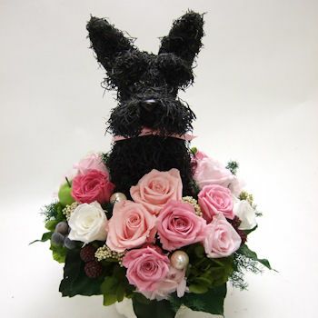 スコティッシュテリア好き、犬好きの人に喜ばれるギフトとしてスコティッシュテリアとお花のアレンジを制作しています。スコティッシュテリア好きの人はやはりスコティッシュテリアをモチーフにした物が何より嬉しいですね。黒くて眉毛があるようなお顔が特徴のスコティッシュテリア。アトリエ花倶楽部ではスコティッシュテリアのトピアリーをオリジナルで制作し、プリザーブドフラワーアレンジにしています。おしゃれなスコティッシュテリアとお花の組み合わせは最高の贈り物ですね。ぬいぐるみとは違う大人っぽい雰囲気がありますので様々なシーンでご利用いただけます。ウェルカムドッグ、結婚祝い、動物病院開院祝い、両親へのプレゼント、楽屋花などのお祝い、また、ペットのお悔やみにも男性へのプレゼントにも感動されています。高級感があり、他にはない特別感がある。見ているととても癒される作品たちです。