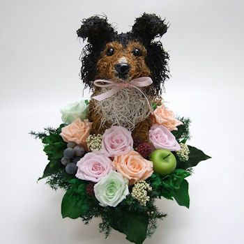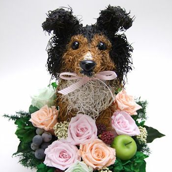 シェットランドシープドッグ好きの人へのプレゼント、おしゃれなシェットランドシープドッグのトピアリープリザーブドフラワーアレンジをオリジナルで制作販売しています。愛らしいシェルティの形をした特別なフラワーギフトです。生花のようなみずみずしさと柔らかな質感を長く楽しめるプリザーブドフラワーを一つひとつ丁寧に使い、トピアリー作家が1つ1つが手作りで仕上げています。アトリエ花倶楽部のオリジナルのこの作品は、材料から厳選した高級なスパニッシュモスで制作しています。おしゃれなシェルティグッズは愛犬家の様々なシーンでご利用いただけ、ウェルカムドッグ、結婚祝い、動物病院開院祝い、両親へのプレゼント、楽屋花などのお祝い、また、ペットのお悔やみにも男性へのプレゼントにも感動されています。高級感があり、他にはない特別感がある。見ているととても癒される作品たちです。