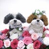 愛犬家の結婚式には欠かせないウェルカムドッグ。可愛いシーズー犬のトピアリーをプリザーブドフラワーアレンジで素敵なウェルカムドールに仕上げました。アトリエ花倶楽部オリジナルの、丁寧な手仕事で制作されるウェルカムドッグは皆様から高評価をいただいております。 ウェルカムドッグとしてお客様をお迎えする大切なお役目を果たすシーズー犬2匹です。花婿さんと花嫁さんのようにウェディングベールとドレスをあしらって高級なプリザーブドフラワーをふんだんに使った、豪華な作品です。お花はプリザーブドフラワーでバラ25輪を中心としたアレンジです。プリザーブドフラワーアレンジはお水のお世話もなく長く飾っていただけますので、ご結婚式後もご自宅のインテリアとしてもお楽しみいただけます。ご結婚祝いにもおすすめです。 プリザーブドフラワーアレンジタイプは犬の部分のトピアリーもプリザーブドフラワーと同じ加工を施してあるモスで制作しています。シーズーはスパニッシュモスを使用しています。