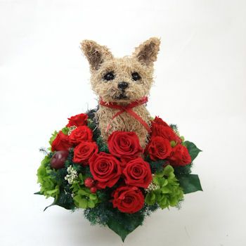 可愛いオリジナルのヨークシャテリアのプリザーブドフラワーアレンジを制作しています。植物素材なのにリアルでかわいいヨークシャテリアのトピアリーとお花の組み合わせはお祝いにもご結婚式にもお悔やみやペットの一周忌にも感動されています。高級感があり、他にはない特別感がある。見ているととても癒されます。