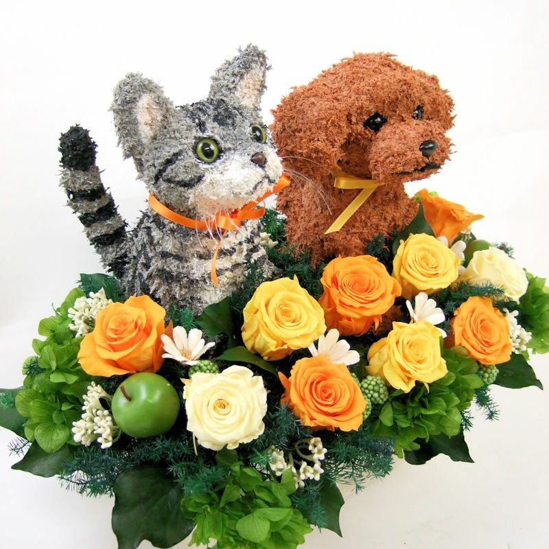 犬と猫のアトリエ花倶楽部オリジナルのトピアリーを プリザーブドフラワーアレンジ、生花アレンジを複数匹をアレンジすることもできますのでご相談ください。犬と猫のトピアリーはリアルでおしゃれなので様々なシーンでご利用いただけます。可愛いですが子供っぽさはなく、ウェルカムドッグ、ウェルカムキャット、結婚祝い、動物病院開院祝い、開店祝い、両親へのプレゼント、楽屋花などのお祝い、また還暦祝いなど特別な日におすすめです。高級感があり、他にはない特別感がある。見ているととても癒される作品たちです。