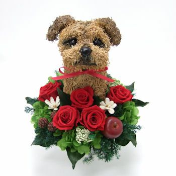 愛犬家にはたまらない可愛いノーフォークテリア犬のトピアリープリザーブドフラワーアレンジです。バラ5輪のPrettyタイプで、犬好きへの誕生日プレゼント、結婚記念日におすすめです。ノーフォークテリアのトピアリーもプリザーブドフラワーと同じ加工をしている高級なスパニッシュモスで制作しています。画像は背中が黒ですが全身茶色にも変更できます。染め場所の指定などがある場合はオーダーメイドでお願いいたします。愛犬家の方はご家族皆様でお楽しみいただけると思います。
