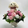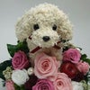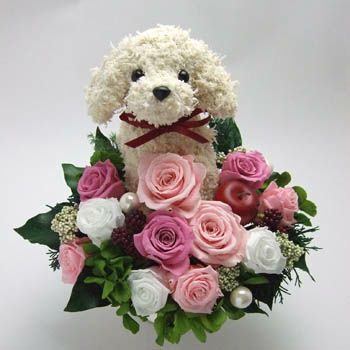 可愛い犬のプリザーブドトピアリーにプリザーブドフラワーを豪華にアレンジしました。マルチーズに見えたりプードルに見えたりラブラドールに見えたり、毎回違うお顔の子ができます。何に似ているかは出来上がってからのお楽しみで、犬種は特定できないタイプです。 プリザーブドフラワーなのでお水の世話も無く長い間生花のような美しさのままお楽しみいただけます。生花のように美しいですがドライフラワーと同じ管理方法です。12輪のプリザーブドフラワーのバラが入って大変豪華です。犬のトピアリーはプリザーブドモスで制作しています。大切な方へのお祝い事、結婚式のウェルカムドッグ、ご両親へのプレゼントぜひおすすめです。犬好きな方へのお花ギフトにおしゃれで大変喜ばれます。