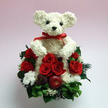 誰からも好まれる幸せのホワイトテディベアのプリザーブドフラワーアレンジ。可愛い白いくまのプリザーブドフラワーアレンジはアトリエ花倶楽部のオリジナルトピアリーです。高級なプリザーブド加工されたモスを使用したぬいぐるみ風なモストピアリーです。お花はプリザーブドフラワーでお水の世話無しで長くお楽しみいただけます。生花のように美しくドライフラワーと同じ管理方法でお水の世話が困難な場合にもおすすめです。 高級感があり上品でギフトにお勧めです。 退職祝い、送別の記念のお花や、結婚祝い、お誕生日プレゼントにもお勧めのお品物です。