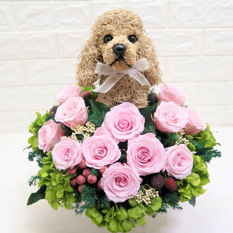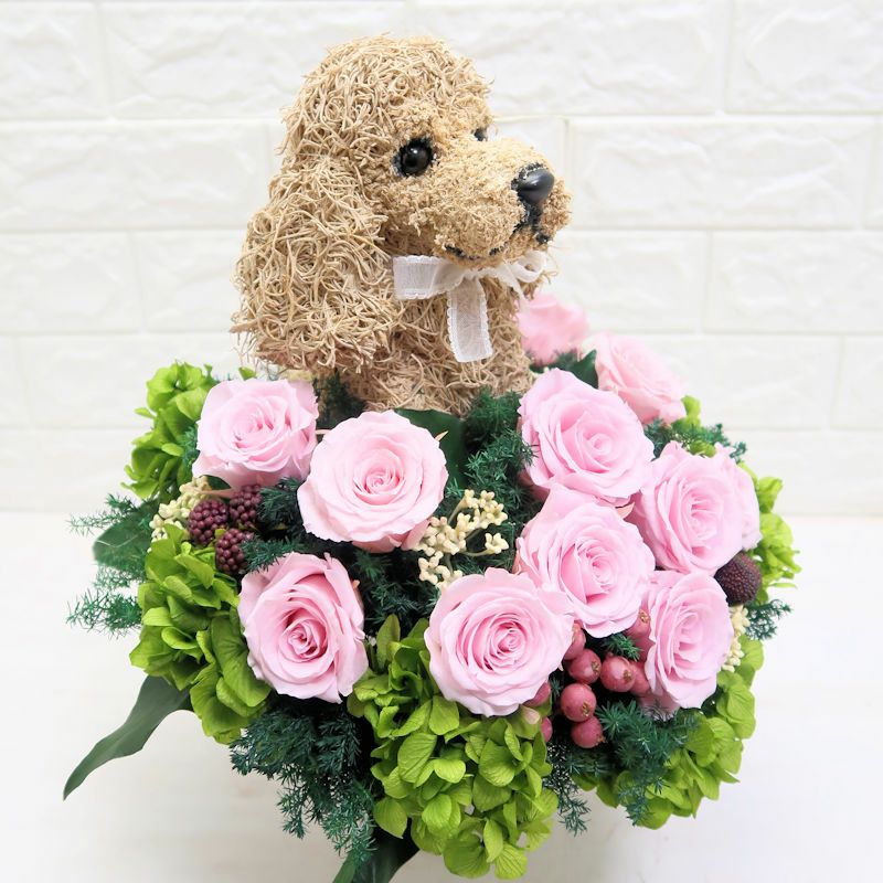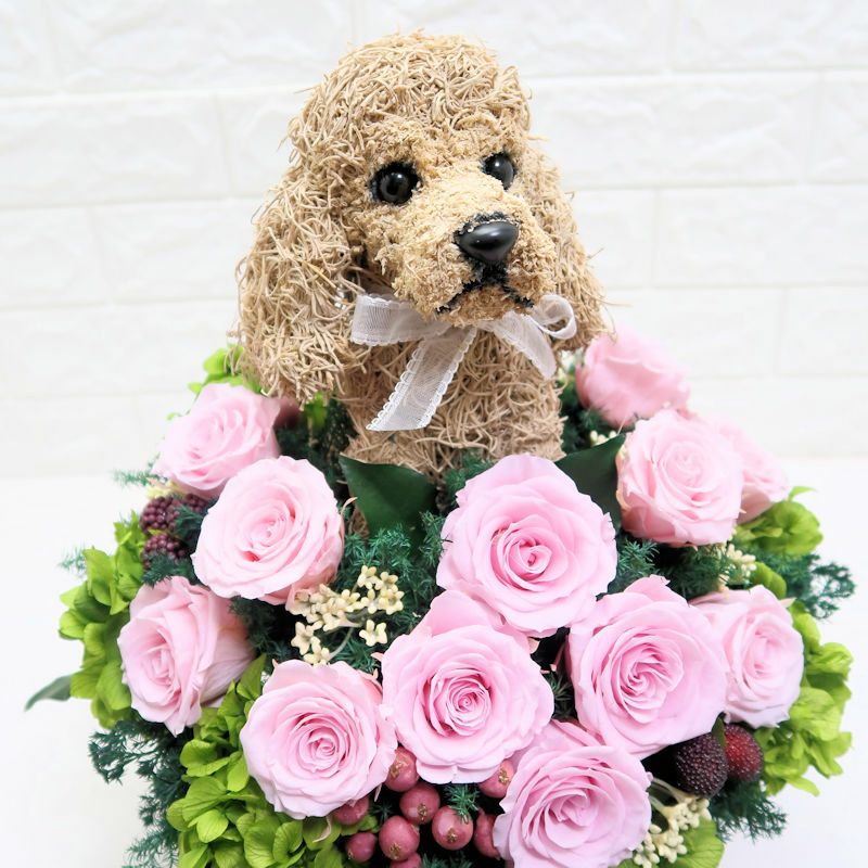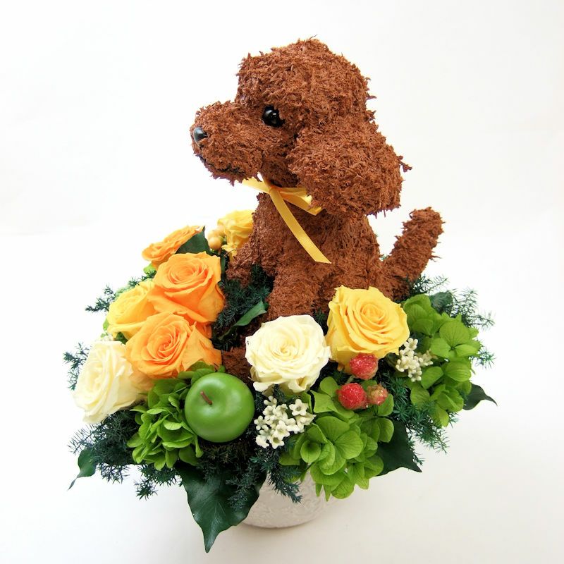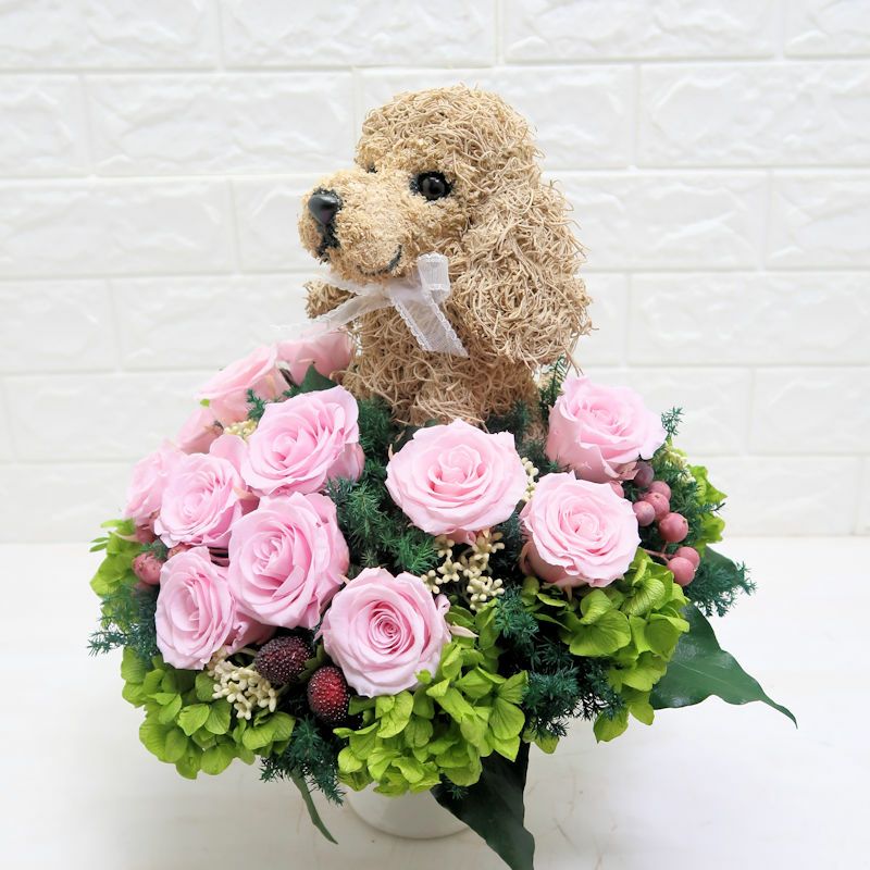 犬好き、猫好きの人へのご結婚祝いに喜ばれる上品でおしゃれな犬のプリザーブドフラワーアレンジ、猫のプリザーブドフラワーアレンジをオリジナルで制作販売しています。ペット関連のお仕事をされている方への結婚祝い、ペットをとても大切にしていらっしゃる方へアトリエ花倶楽部オリジナルのおすすめ結婚祝いのプレゼントです。犬をモチーフにしたグッズ、猫をモチーフにしたグッズは色々ありますが、子供っぽくなく上品でご結婚祝いに適している特別感のある作家が1つ1つ制作した犬や猫たちとお花のアレンジです。ペット好きなお二人にぴったりのご結婚祝いをプレゼントしてください。ご結婚式でウェルカムドールとしてご結婚祝いを飾る方もいらっしゃいます。