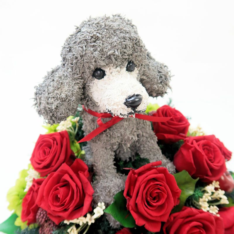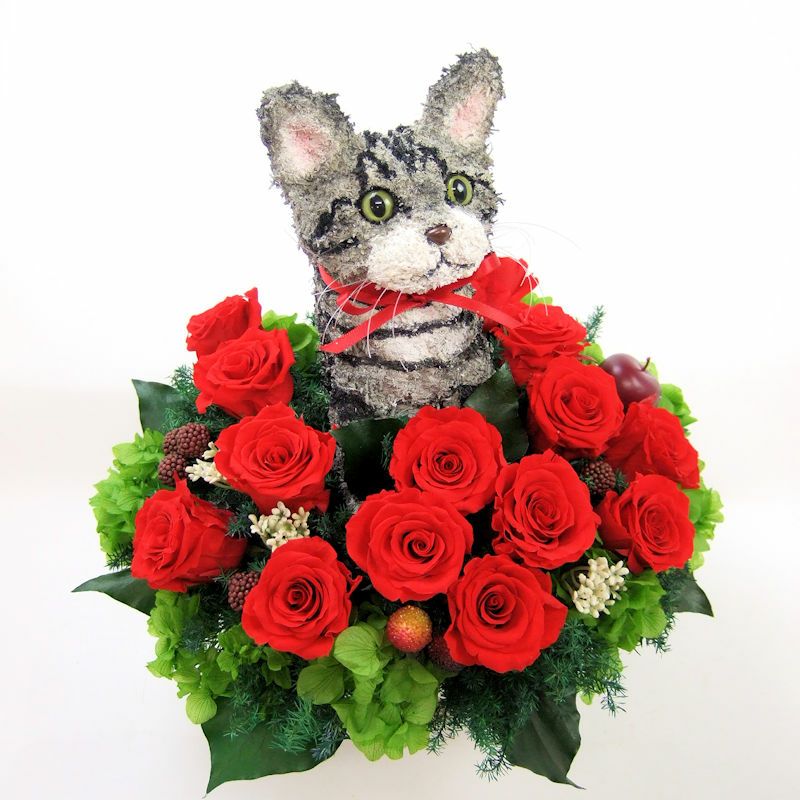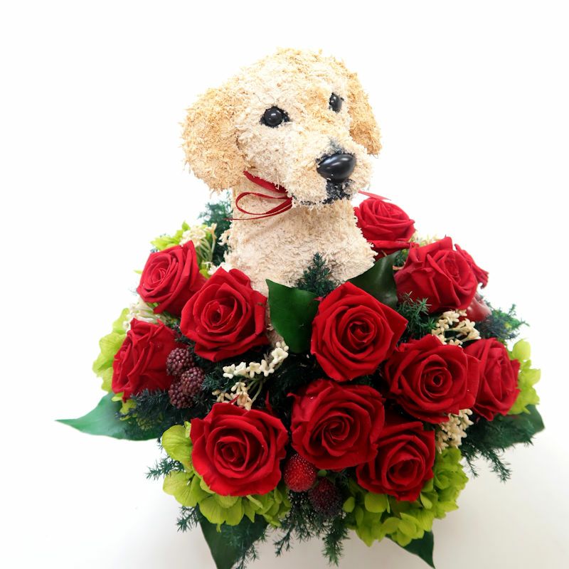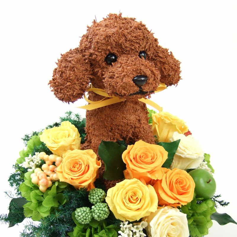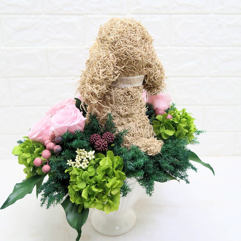 犬好き、猫好きの人へのご結婚祝いに喜ばれる上品でおしゃれな犬のプリザーブドフラワーアレンジ、猫のプリザーブドフラワーアレンジをオリジナルで制作販売しています。ペット関連のお仕事をされている方への結婚祝い、ペットをとても大切にしていらっしゃる方へアトリエ花倶楽部オリジナルのおすすめ結婚祝いのプレゼントです。犬をモチーフにしたグッズ、猫をモチーフにしたグッズは色々ありますが、子供っぽくなく上品でご結婚祝いに適している特別感のある作家が1つ1つ制作した犬や猫たちとお花のアレンジです。ペット好きなお二人にぴったりのご結婚祝いをプレゼントしてください。ご結婚式でウェルカムドールとしてご結婚祝いを飾る方もいらっしゃいます。