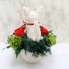 白い猫のプリザーブドフラワーアレンジ、猫好きの人にはたまらないプレゼントですね。白猫の形のトピアリーとプリザーブドフラワーのアレンジです。あどけないお顔の可愛い白猫ちゃん。お花はプリザーブドフラワーでバラ8輪を中心としたアレンジで、おしゃれな贈り物になりますね。お水の世話もなく長い間きれいにご覧いただけます。猫好きの人には猫のモチーフの物は喜ばれます。アトリエ花倶楽部のオリジナルですので他にはないという点でも喜んでいただけると思います。プリザーブド加工されている高級モスでできているトピアリーですが、プリザーブドモスは材料のときに白っぽい色で入荷されてきますが時間とともに変色するため色を白くつけることにしました。白い色は他のものと染料が違うため多少色むらが出ることがあります。