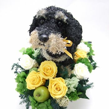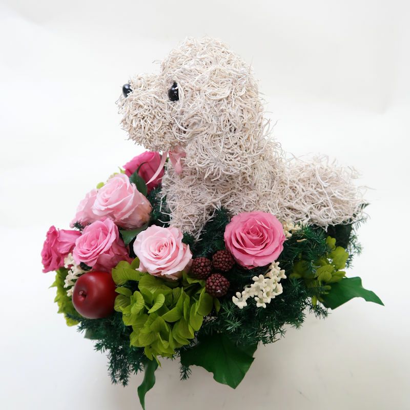 アトリエ花倶楽部のオリジナル犬猫動物トピアリーは1つずつの手作りで他には無いものです。プリザーブドフラワー、生花アレンジ、鉢植えともに喜ばれる特別な贈り物です。