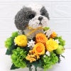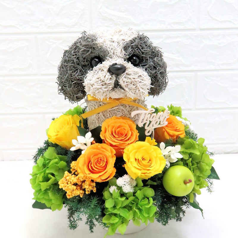 犬好きお母さんの最高の笑顔が見られる特別なプレゼント。シーズー好きのお母さんが喜ぶシーズーのトピアリープリザーブドフラワーアレンジです。シーズーのトピアリーはアトリエ花倶楽部のオリジナルで他には無く、可愛いけれど子供っぽくならない特別なアレンジメントです。小さなthank youプレートで感謝と手作りで温かみのあるプリザーブドフラワーアレンジで愛犬との思い出を贈りましょう。お花だけじゃ物足りないというこだわり派の方、犬とお花の素敵なアレンジを探している方へおすすめのプリザーブドフラワーアレンジです。このまま長く飾っていただけるのもうれしいポイントです。
