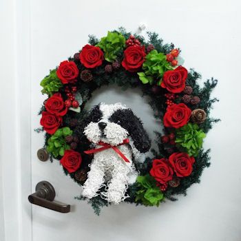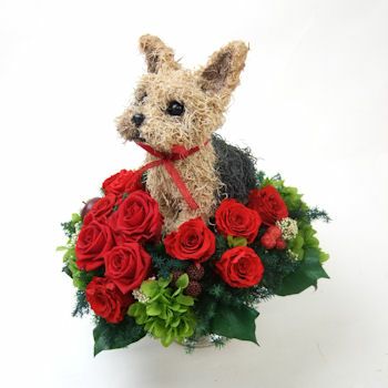 犬や猫の形をしたフラワーギフトは、ペットサロンのオーナーやスタッフの人にとても好評です。ペットサロンの看板犬と同じ犬種やお客様のワンチャンを選ばれる方が多いです。犬モチーフのグッズです。記念になるように小さなお名前プレートや大きめのお名前プレートをオプションでお選びになることも喜ばれます。作家の制作する犬や猫のお花として感動される作品です。サロンの雰囲気やイメージカラーに合わせてお花やギフトを選ぶと、より喜ばれます。