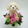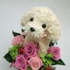 犬の形のプリザーブドフラワーアレンジ。アトリエ花倶楽部のオリジナルトピアリーで高級なプリザーブドモスを使用したぬいぐるみ風なトピアリープリザーブドフラワーアレンジです。 マルチーズにも見えたりプードルに見えたりするらしい犬のプリザーブドトピアリー。お花はプリザーブドフラワーで生花のように美しいですが、お水の世話もなく長い間きれいにご覧いただけます。ドライフラワーと同じ管理方法です。 犬種は特定できません。耳の垂れている犬です。 「可愛らしい顔で見つめられると笑顔になってしまいます」とお客様から言われる作品です。