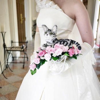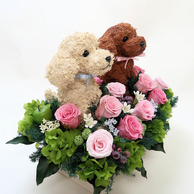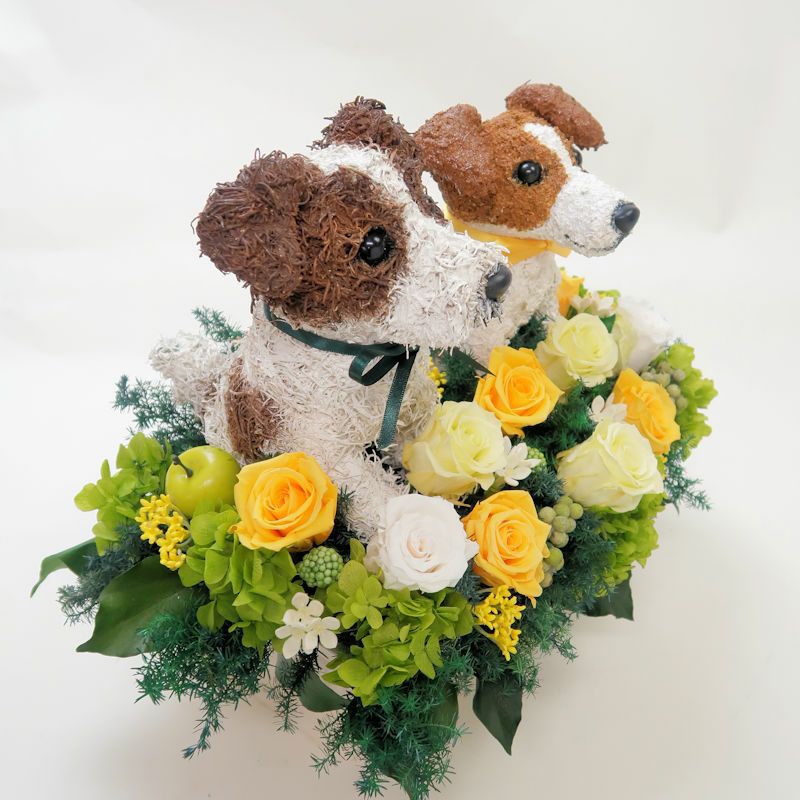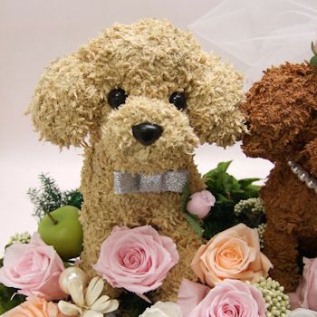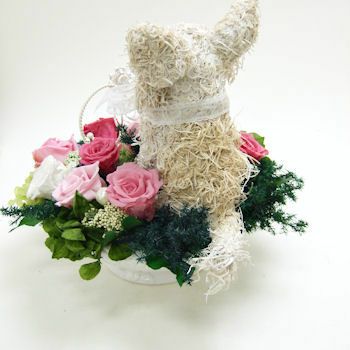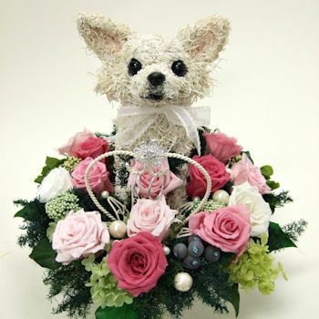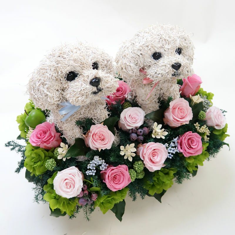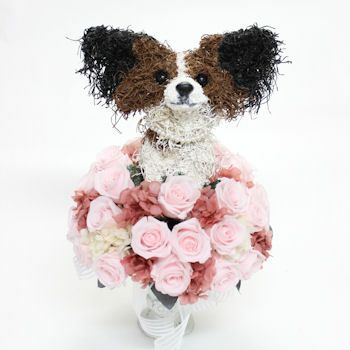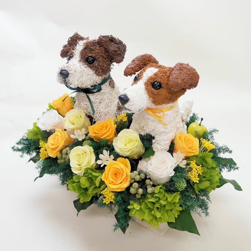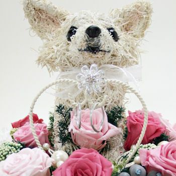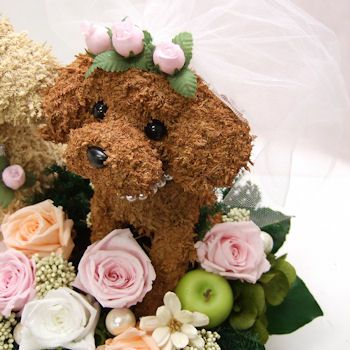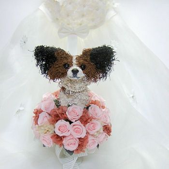 ペットと一緒に結婚式ができたら。家族であるペットも一緒に参加できるご結婚式はいいですね。 ペットと同じ犬種、猫種の形のトピアリーとプリザーブドフラワーアレンジなどでウェルカムドッグ、ウェルカムキャット、ペットのウェディングブーケを制作しています。愛犬家や愛猫家のお二人ならではのご結婚式になりますね。けれどペット同伴のご結婚式場はまだまだ少なく「どんな形でもペットの存在を感じたい」また、「他とは違う結婚式がしたい」また、職業が動物病院従事者、トリマーさんなど動物に関するお仕事をされていらっしゃる方の個性ある、上品でおしゃれなご結婚式になるようなウェルカムドッグ、ウェルカムキャットをお届けしています。
