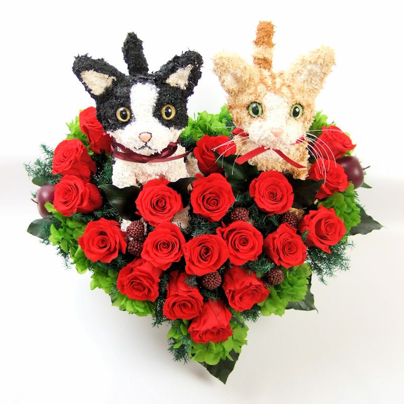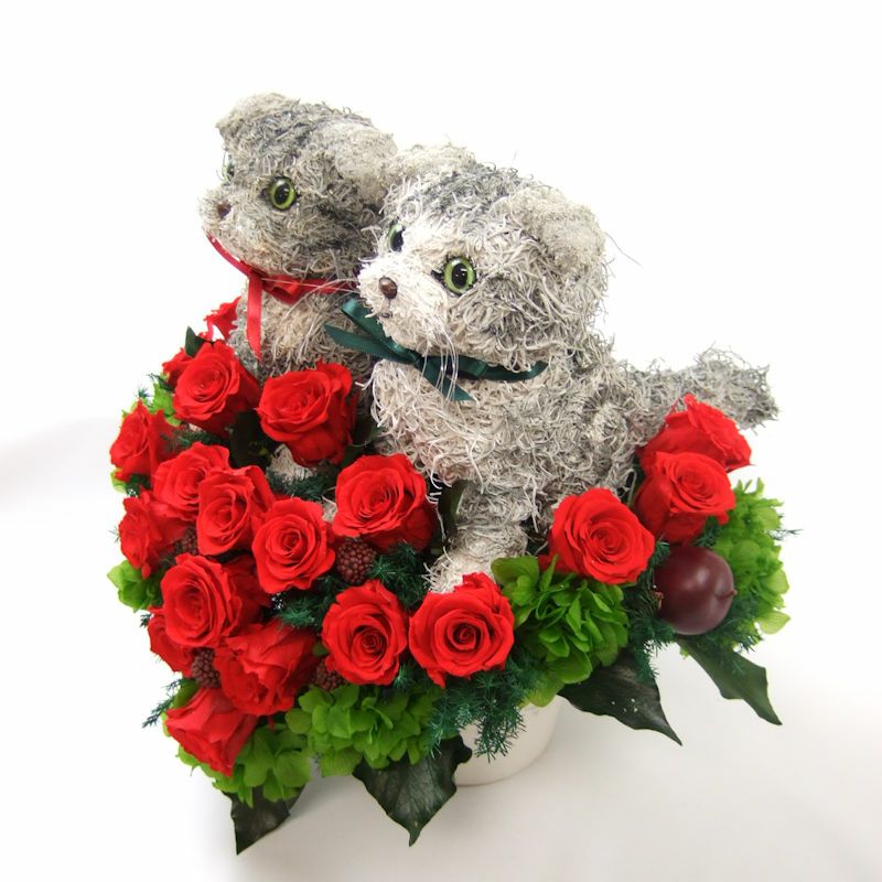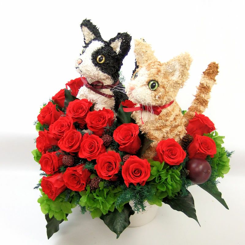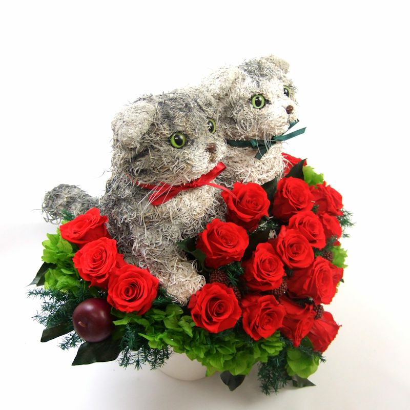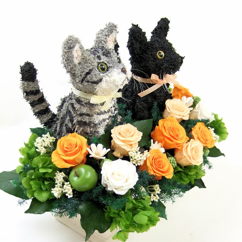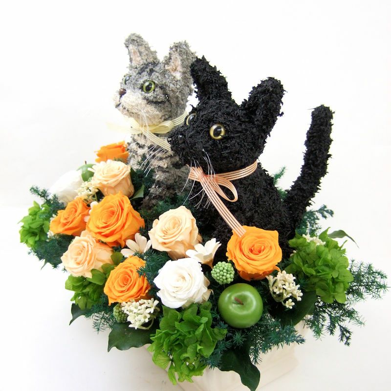 ウェルカムキャットをオリジナルのトピアリー プリザーブドフラワーアレンジなどで制作しています。画像以外の猫の種類との組み合わせも制作できますのでお気軽にお問い合わせください。猫好きの方のご結婚式のウェルカムキャットにはもちろん、開店祝いや開院祝いにも喜ばれます。