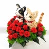 猫2匹のウェルカムドールをハートの形のプリザーブドフラワーにアレンジしました。こちらの作品は白黒猫と茶トラ猫の組み合わせですが他の猫の組み合わせでもおつくりすくことが可能です。猫の種類によって多少お値段が変わることがありますが、組み合わせは色々できます。他の猫の種類をご希望の場合はお問い合わせください。お花はプリザーブドフラワーで生花のように美しいですが、お水の世話無しで長くお楽しみいただけます。生花のように美しくドライフラワーと同じ管理方法です。お水の世話が困難な場所にもおすすめです。 トピアリーもプリザーブドフラワーと同じ加工を施してあるモスで制作しています。猫とお花のアレンジ。ご結婚祝いや猫好きの人のご結婚式の受付にウェルカムドールとして活躍してくれます。猫好きのお二人ならではの演出になりますね。ご結婚式後も長くお部屋のインテリアとして飾っていただけます。